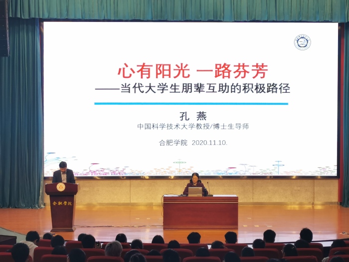 11月10日,由校黨委學生工作部、學生處主辦的大學生心理健康教育報告會在學術報告廳A廳舉行。報告會邀請了中國科學技術大學二級教授、博士生導師、中科大心理教育中心首任主任孔燕教授為我校全體班級心理委員上了精彩的一課。會議由校黨委委員、學生處處長朱濤主持。