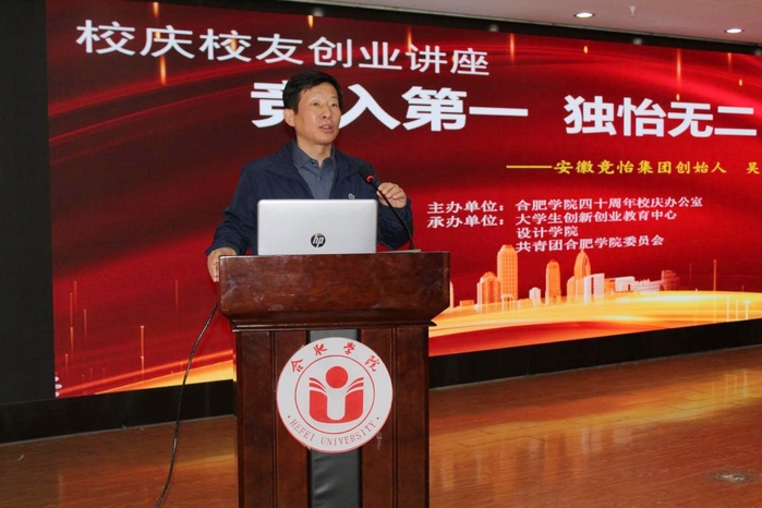 11月26日下午,由大學生創新創業教育中心、設計學院和共青團合肥學院委員會共同舉辦的校慶校友第三期創業講座在大學生活動中心舉行。2013屆優秀畢業校友吳銳做了題為《競入第一 獨怡無二》的創業報告。