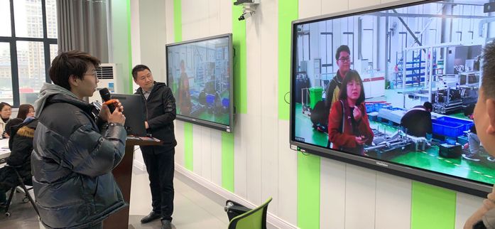 活動期間,教務(wù)處孔春華老師在現(xiàn)場協(xié)調(diào)兩地直播進度及模式切換,教務(wù)處徐厚昌老師、先進制造工程學(xué)院馮敏亮老師分別在學(xué)校現(xiàn)場、企業(yè)現(xiàn)場擔(dān)任直播主持。學(xué)校活動現(xiàn)場設(shè)在合肥學(xué)院多媒體智慧教室35棟305室,共有42名機械電子工程、機械設(shè)計制造及其自動化等相關(guān)專業(yè)學(xué)生參加,多位老師在場協(xié)調(diào)安排;企業(yè)活動現(xiàn)場設(shè)在哈工大機器人(合肥)研究院、合肥哈工龍延智能裝備有限公司等地,部分實習(xí)學(xué)生、指導(dǎo)老師、企業(yè)導(dǎo)師等在現(xiàn)場,通過專業(yè)攝像設(shè)備進行實況直播。網(wǎng)絡(luò)媒介將學(xué)校現(xiàn)場與企業(yè)現(xiàn)場連接,形成實時互動,達到線上線下混合式實時結(jié)合。