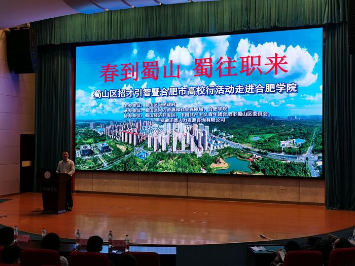 5月14日下午,由合肥市蜀山區(qū)人民政府主辦,蜀山區(qū)人社局和合肥學院承辦的“春到蜀山、蜀往職來”蜀山區(qū)招才引智暨合肥市高校行(合肥學院站)活動在我校圖書館學術報告廳A廳舉行。合肥市大中專畢業(yè)生就業(yè)指導中心主任楊永哲,蜀山區(qū)委常委、常務副區(qū)長劉智,蜀山區(qū)人力資源和社會保障局副局長楊軍、團區(qū)委副書記趙曉云、經(jīng)濟開發(fā)區(qū)社會事務局局長朱江,我校黨委委員、學生處處長朱濤,各二級學院黨委副書記、學工辦負責人、就業(yè)聯(lián)絡員、畢業(yè)班輔導員和部分學生代表參加活動。