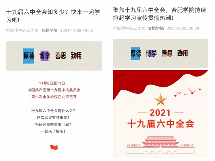 著力創(chuàng)新學(xué)習(xí)載體,全面增強(qiáng)學(xué)習(xí)實(shí)效。合肥學(xué)院充分發(fā)揮各級(jí)各類媒體的作用,加大宣傳力度,校園官網(wǎng)上線“學(xué)習(xí)貫徹黨的十九屆六中全會(huì)精神”熱點(diǎn)專題、“學(xué)習(xí)進(jìn)行時(shí)”專欄,學(xué)校官方微信公眾號(hào)及時(shí)推送黨的十九屆六中全會(huì)相關(guān)推文,制作十九屆六中全會(huì)專題簡報(bào)等等,通過線上線下一體化宣傳,不斷豐富擴(kuò)充學(xué)習(xí)渠道和資源,全方位宣傳解讀十九屆六中全會(huì)精神內(nèi)涵,常態(tài)化報(bào)道展示全校上下學(xué)習(xí)貫徹全會(huì)精神相關(guān)情況,掀起學(xué)習(xí)宣傳貫徹十九屆六中全會(huì)精神的熱潮。