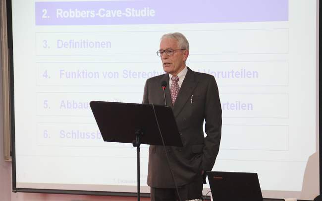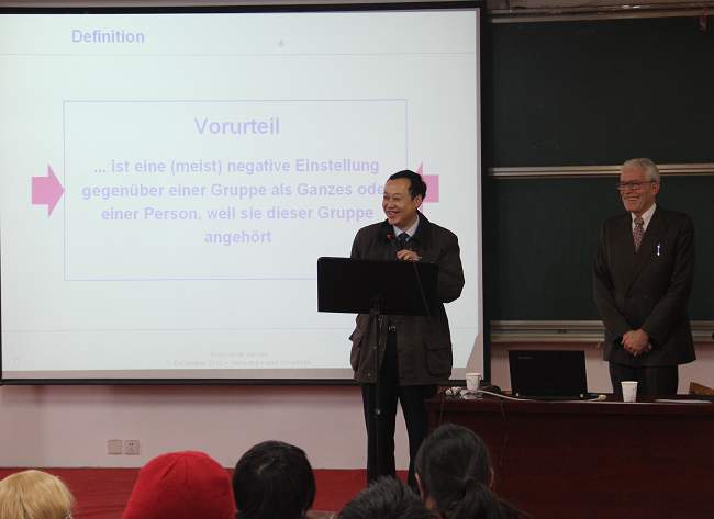 應我院邀請,12月7日上午,德國奧斯納布呂克大學(Universität Osnabrück)漢斯-沃爾夫?奚偉德教授(Prof. Dr. Hans-Wolf Sievert)在學院一期六號樓學術報告廳為我院師生做了一場學術報告,主題是“跨文化交際中的刻板印象、偏見及防范”。報告由國際教育學院徐剛副院長主持,國際教育學院及外語系的德語教師及我院中德合作專業和德語專業的學生到場聆聽。