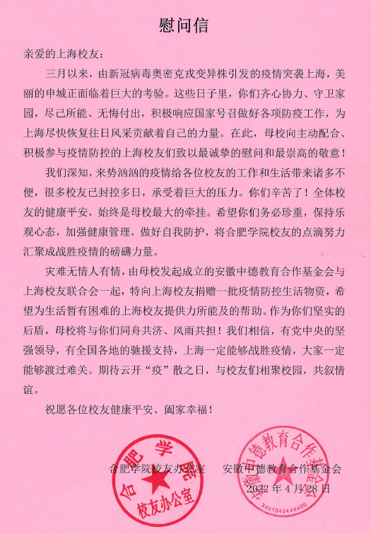 三月以來,由新冠病毒奧密克戎變異株引發的疫情突襲上海,疫情防控形勢嚴峻復雜。合肥學院在守護好校園防疫安全的同時,也時刻心系在滬校友及其家人的健康平安。在學校黨政的高度重視和關心指導下,4月28日,校友辦和安徽中德教育合作基金會代表學校共同向上海校友發出了《慰問信》,鼓勵大家堅定信心,凝心聚力,共抗疫情,表達母校對校友們的關懷與牽掛。