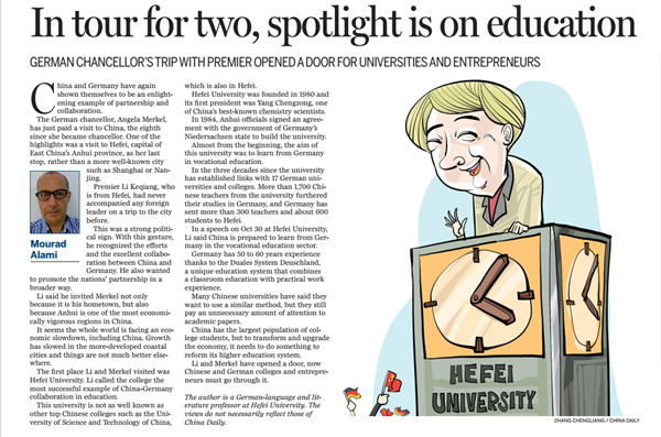 10月30日,國務院總理李克強與德國總理默克爾訪問安徽省會合肥,參觀了合肥學院并共同出席一系列重要活動。11月6日,在合肥學院任教的德國專家穆拉德·阿拉米(Mourad Alami)在中國日報社主辦的《中國日報歐洲版》(China Daily European Weekly)上發(fā)表評論文章《中德總理訪問合肥,教育合作成焦點》(In tour for two, spotlight is on education)。