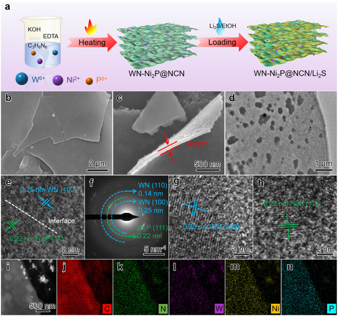 團隊發現并驗證了WN-Ni2P在提升鋰硫電池性能方面的關鍵作用。相關研究以“In?situ construction of WN-Ni2P heterostructures embedded in nitrogen?doped carbon nanoflakes as lithium sulfide hosts for advanced lithium?sulfur batteries”為題,發表于《Rare Metals》。梁升為第一作者,合肥大學能源材料與化工學院為第一完成單位。