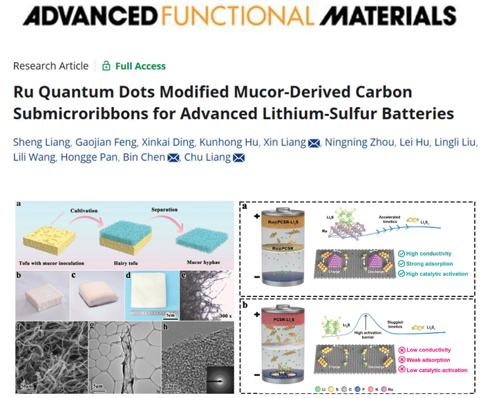 團隊創新性地從中國傳統美食毛豆腐中分離毛霉菌菌絲,并基于該菌絲合成碳亞微帶,用于鋰硫電池改性研究。該研究成果以“Ru Quantum Dots Modified Mucor-Derived Carbon Submicroribbons for Advanced Lithium-Sulfur Batteries”為題,發表在《Advanced Functional Materials》上(DOI: doi.org/10.1002/adfm.202420162)。梁升為第一作者,梁鑫為通訊作者,合肥大學能源材料與化工學院為第一完成單位。