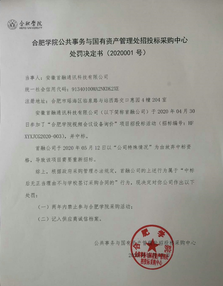 合肥學院視頻會議設備詢價項目(項目編號:HFXYXJCG2020-003)于2020年4月30日開標,中標供應商為安徽首融通訊科技有限公司(以下簡稱首融公司),該公司于2020年5月12日向我校投遞棄標函,根據學院相關規定,該項目作流標處理。