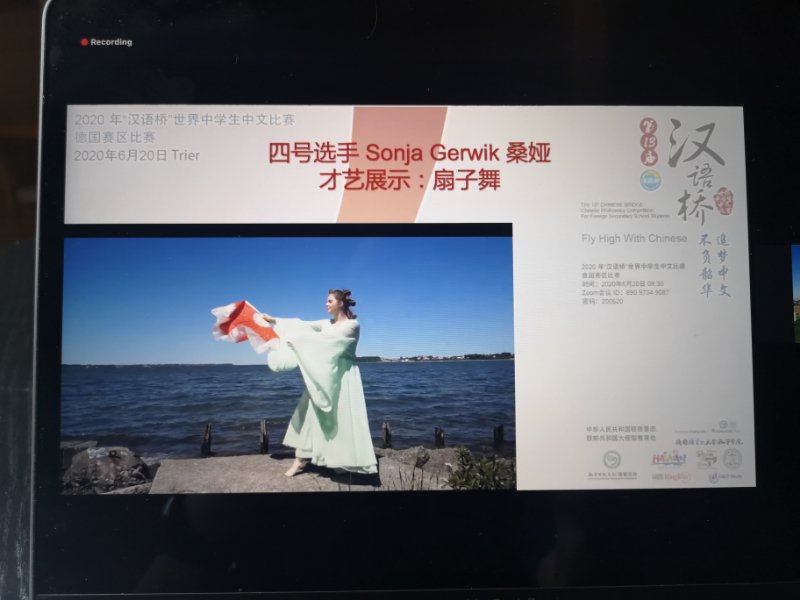 德國時間6月20日,由中國駐德國大使館主辦、特里爾大學孔子學院承辦的2020年第13屆“漢語橋”世界中學生中文比賽德國賽區決賽落下帷幕。受新冠肺炎疫情影響,本屆比賽首次采用了視頻會議的形式。13名來自德國不同城市的中學生圍繞“追夢中文,不負韶華”的主題通過中文演講、知識問答和才藝展示等環節展現自己對中國文化的熱愛。