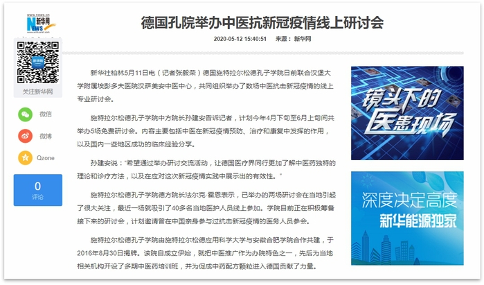 此次疫情同時在歐洲多國肆虐,目前德國醫療系統承受著巨大的壓力,在進一步相對有效控制住本國疫情的同時,還接收了大量來自法國、意大利等鄰國的重癥患者。中醫藥及中西醫結合診療在中國的成功經驗,也獲得了德國醫療專業人士的廣泛關注。借此契機,合肥學院在德國施特拉爾松德共建的施特拉爾松德孔子學院聯合德國漢堡大學附屬埃彭多夫醫院漢薩美安中醫中心,共同組織舉辦了數場中醫抗擊新冠疫情的線上專業研討會。按照計劃,從4月下旬至6月上旬間共計舉辦5場免費研討會,內容主要包括中醫藥在此次新冠疫情預防、治療和康復中發揮的作用,以及中國國內一些地區成功的臨床經驗分享。施特拉爾松德孔子學院中方院長孫建安表示,希望通過舉辦研討交流活動,讓德國醫療界同行更加了解中醫藥獨特的理論和診療方法,以及在應對這次新冠疫情實踐中展示出的有效性。施特拉爾松德孔子學院德方院長法爾克·霍恩教授表示,已舉辦的兩場研討會在當地引起了很大關注,最近一場就吸引了40多名當地醫護人員線上參加。學院目前正在積極籌備接下來的研討會,計劃邀請曾在中國親身參與過抗擊新冠疫情的醫務人員參會。