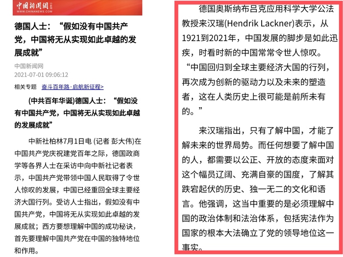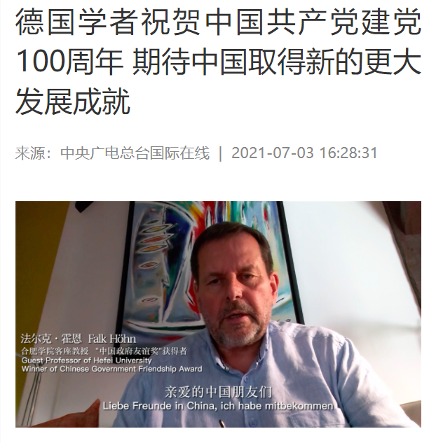 “衷心祝賀中國共產黨100歲華誕,并祝愿你們取得更大的成就!”在中國共產黨成立100周年之際,我校德國專家、中國政府友誼獎獲得者、德國施特拉爾松德孔子學院德方院長法爾克·霍恩教授,安徽省人民政府黃山友誼獎獲得者、德國奧斯納布呂克應用科學大學教授米夏爾·舒勒和來漢瑞送上誠摯的祝福。他們高度評價了中國近年來在經濟、社會各發展領域中所取得的偉大成就,對中國共產黨百年征程鑄就的輝煌歷史表示贊賞,并期待中國在共產黨領導的新征程中開創更加美好的未來。對此,央視新聞、中央廣電總臺國際在線、中國新聞網等多家主流媒體紛紛予以報道。