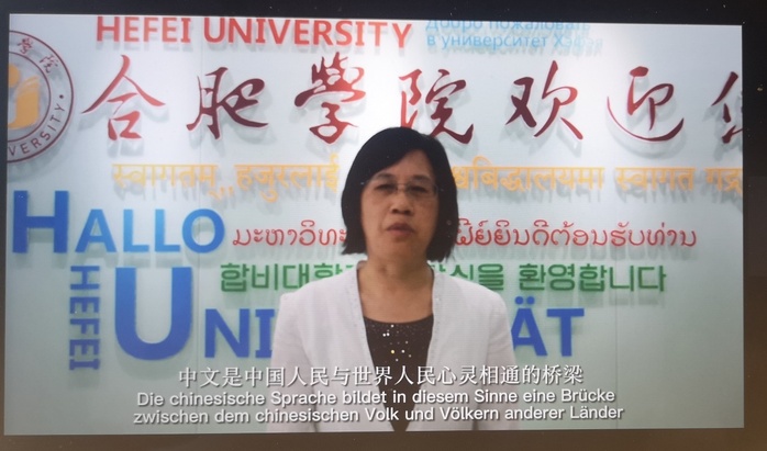 Wu Chunmei sagte in ihrer Rede, dass die Freundschaft zwischen den Nationen in der N?he der Menschen liege und die N?he der Menschen in der Verbindung der Herzen liege. Chinesisch schl?gt eine Brücke zwischen den Herzen des chinesischen Volkes und den Menschen der Welt. Die Universit?t Hefei hat ein Konfuzius-Institut in Deutschland gegründet und das deutsche Finale des Wettbewerbs Chinese Bridge ausgerichtet. Sie wünschte allen Teilnehmern gute Ergebnisse und hoffte, dass Chinese Bridge die Brücke schlagen und das Band des Austauschs zwischen den beiden V?lkern knüpfen werde.