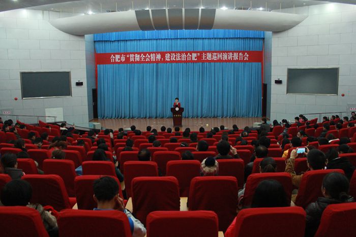 為深入學習貫徹黨的十八屆四中全會精神,大力弘揚社會主義法治理念和法治精神。1月13日,合肥市“貫徹全會精神,建設法治合肥”主題巡回演講報告會于我校二區(qū)圖書館學術報告廳A廳舉行,八名進入合肥市決賽的選手為大家?guī)砹司恃葜v。市委宣傳部宣教處副處長魏琪、合肥市經(jīng)開區(qū)工委辦副主任俞光遠、我校黨委宣傳部部長白義香和團委副書記朱濤、包河區(qū)各街道宣傳委員、社區(qū)普法員和宣傳委員以及我校師生共300多人出席報告會。