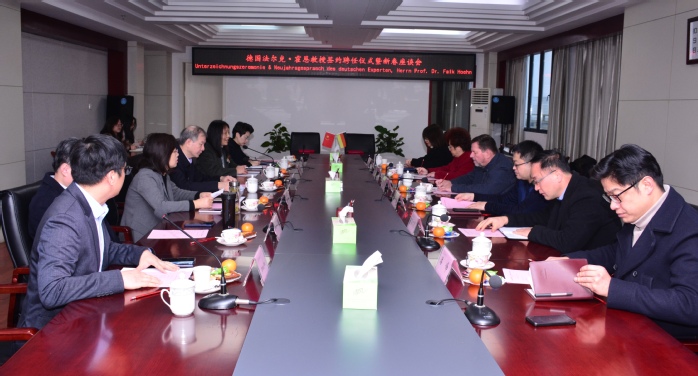 2月10日上午,我校在行政樓九樓東會議室舉辦外籍教授聘任儀式暨新春座談會,來自德國漢諾威應用科學大學的法爾克·霍恩受聘為學校外籍教授。黨委書記王其東、院長吳春梅出席儀式,組織部、教務處、人事處、國際交流合作處、研究生處、設計學院、外國語學院等相關單位負責人參加儀式。王其東給霍恩教授頒發聘書,人事處處長紀平代表學校與霍恩教授簽訂聘任協議。