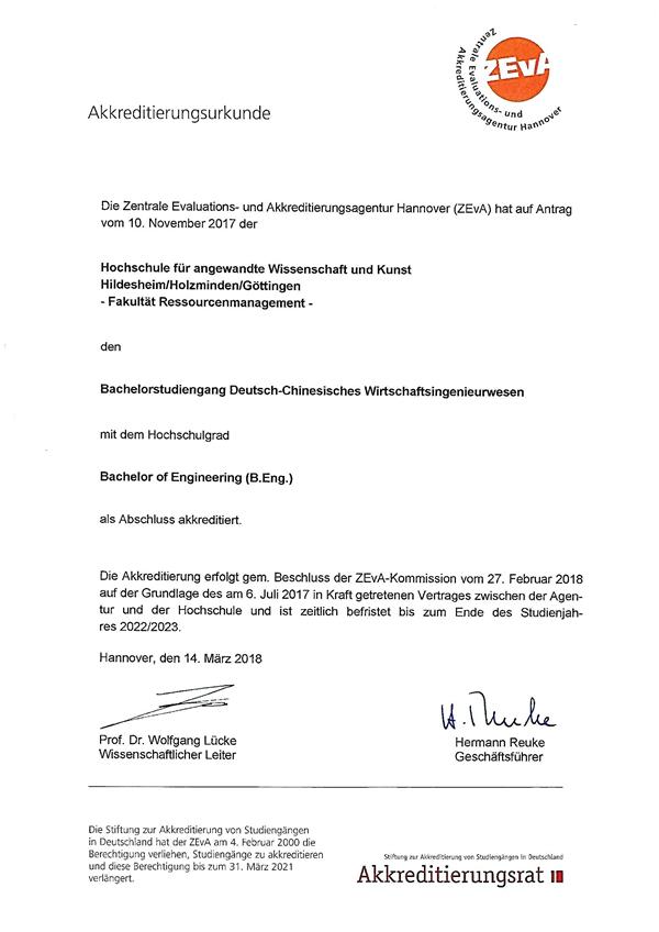 Der Bachelorstudiengang ?Deutsch-Chinesisches Wirtschaftsingenieurwesen“ wurde erfolgreich akkreditiert