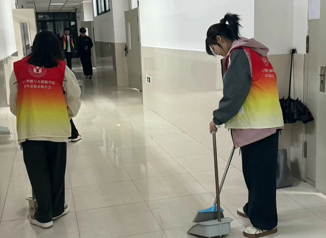 當(dāng)天傍晚,志愿者們攜帶衛(wèi)生工具,進(jìn)入教學(xué)樓進(jìn)行清掃。經(jīng)過(guò)志愿者的共同努力,教學(xué)樓各樓層煥然一新,校園環(huán)境更加整潔。