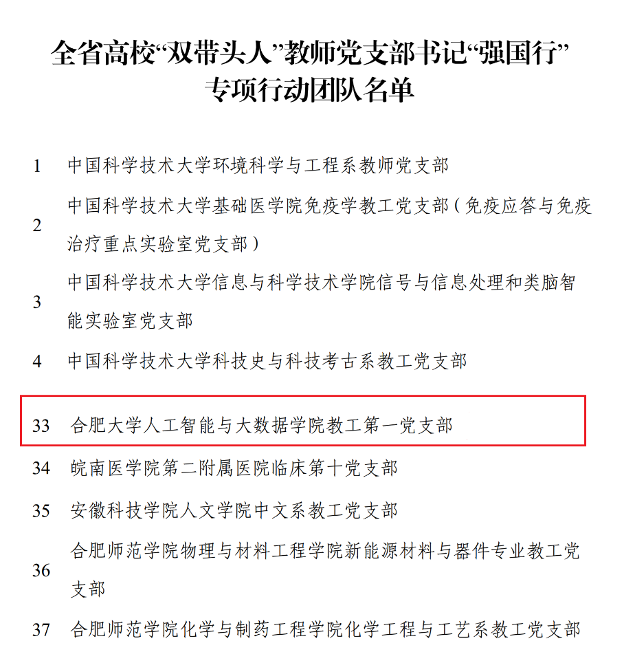 近日,中共安徽省委教育工委公布了全省高校 “雙帶頭人”教師黨支部書記“強國行” 專項行動團隊名單,人工智能與大數據學院教工第一黨支部成功入選。