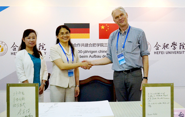 會上,瓦歇爾教授圍繞“準穩態”進行學術報告,討論了參數依賴多項式常微分方程模型的化學反應網絡。在參觀我校中德合作共建三十周年成果展中,他表示,中徳兩國合作成果豐碩,教育教學的研究更是卓有成效,合肥學院三十年的中徳合作歷史尤為重要,為兩國合作做出重大貢獻。他還指出合肥學院的發展日新月異,并希望能夠與合肥學院繼續加強交流,加深在學術研討方面的探索。