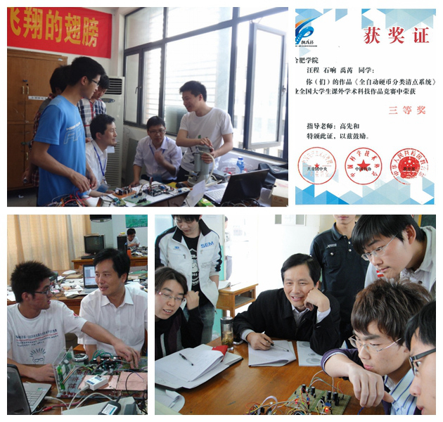 說起自己學(xué)生的成績(jī),高先和便滔滔不絕,沒有什么比看到學(xué)生們?cè)谝淮未胃?jìng)賽中斬金奪銀更加驕傲自豪的事。2009、2013年獲得全國大學(xué)生電子競(jìng)賽一等獎(jiǎng),省內(nèi)一等獎(jiǎng)?wù)急扰旁谇傲?。在這些作品中,不乏被新華網(wǎng)、新安晚報(bào)等多家媒體爭(zhēng)相報(bào)導(dǎo)的智能創(chuàng)新成果,如“硬幣清點(diǎn)系統(tǒng)”利用傳感器技術(shù)、根據(jù)硬幣的材料不同判斷其真假并進(jìn)行分類,降低了許多假幣損失,為公交車和銀行省了不少麻煩,有很好的市場(chǎng)前景?!爸悄艹小笔菇Y(jié)賬只需要幾秒鐘;“聰明座椅”讓學(xué)生徹底告別早起占座。如今,高先和將團(tuán)隊(duì)工作室搬到同學(xué)們的研究地,讓同學(xué)們參與產(chǎn)品設(shè)計(jì)的全過程,熟悉研發(fā)的必要科學(xué)環(huán)境。2013級(jí)電子信息工程系電協(xié)會(huì)長(zhǎng)汪程同學(xué)表示,老師們的項(xiàng)目經(jīng)驗(yàn)讓自己在參加學(xué)科競(jìng)賽少走了不少彎路。因?yàn)楦呃蠋煱滋煊薪虒W(xué)任務(wù),所以經(jīng)常凌晨三點(diǎn)多,這里還是燈火通明,師生們還在互相交流、修改完善項(xiàng)目。