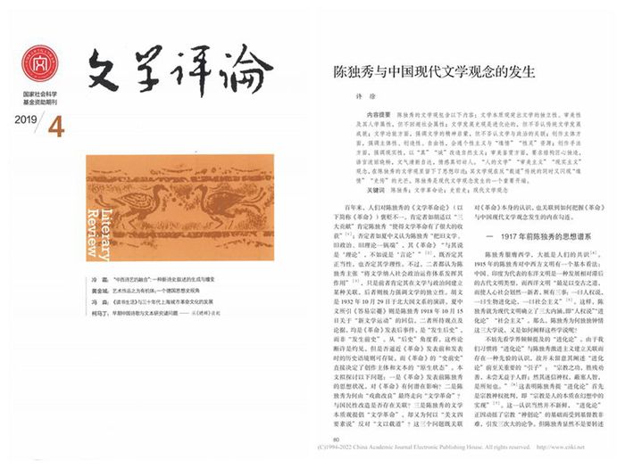 論文《陳獨秀與中國現代文學觀念的發生》以反思西方中心論為背景,以“內應外援”為立場,以“史前史”為方法,系統分析皖籍新文化旗手陳獨秀之文學觀,以點帶面研究中國現代文學觀念的發生,使人們看到陳獨秀文學觀的復雜性以及對“五四”文學觀念產生的重大影響。研究成果既體現了建設中國文論話語體系的努力,也體現了還原皖籍新文化人物群體歷史貢獻的努力,可為當代中國文論和安徽文化強省建設提供重要支撐。
