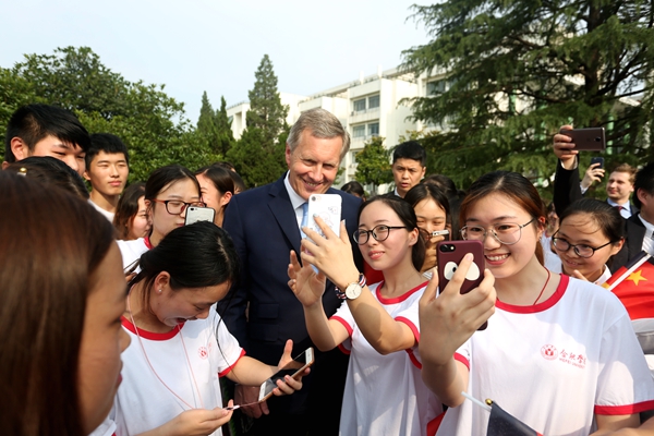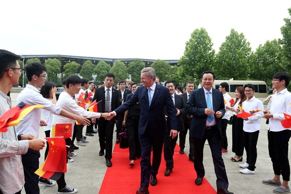 Herr Pr?sident Christian Wulff hielt an der Universit?t Hefei eine Rede, in der er auf die Geschichte der Partnerschaft zwischen der Provinz Anhui und dem Bundesland Niedersachsen, die erfolgreiche Zusammenarbeit auf den Gebieten Landwirtschaft, Lebensmittelbearbeitung, Maschinenbau und Industriedesign zurückblickte. Ferner sprach sich Herr Wulff auch für mehr Zusammenarbeit bei internationalen Projekten wie der neuen Seidenstra?e aus. Herr Wulff erkl?rte auch, dass die Bildung eine bedeutsame Rolle spiele und dass die Einführung eines dualen Studiengangs mit der ?Continental Klasse“ besonders vorteilhaft für kleine und mittelst?ndische Betriebe in Hinsicht auf die Ausbildung von hochqualifizierten Fachkr?ften sei.