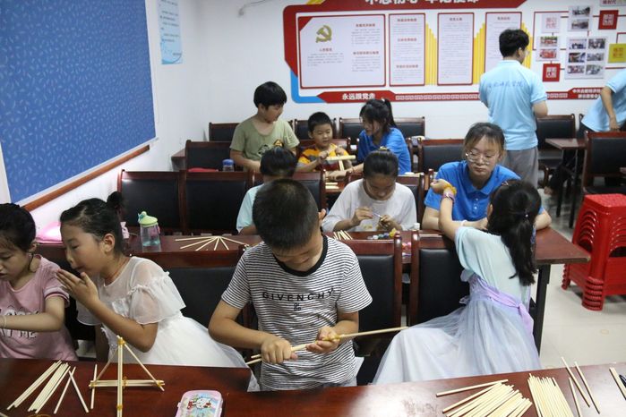城市建設與交通學院“紅心向黨”小分隊組織小朋友們進行筷子搭建比賽,讓他們感受力學結構的獨特魅力。團隊成員們把專業知識以游戲的方式進行教學,用實際行動踐行“科技下鄉”。