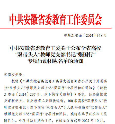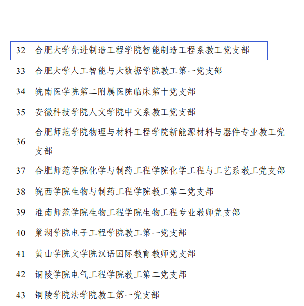 近日,中共安徽省委教育工委公布的全省高校“雙帶頭人”教師黨支部書記“強國行”專項行動團隊名單中,合肥大學先進制造工程學院智能制造工程系教工黨支部獲批此項榮譽。