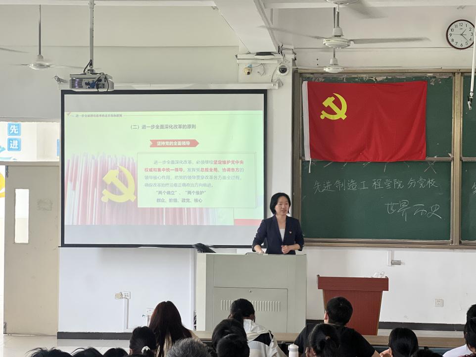 2025428日中午,先進制造工程學院分黨校第十期入黨積極分子培訓班第四次理論授課于383階梯教室舉行,本次黨課由馬克思主義學院閃茜菁教授進行授課。培訓班共114名學員參加了本次課程,本次黨課主題是“新時代新征程,答好進一步全面深化改革這道題——學習領悟黨的二十屆三中全會精神”。