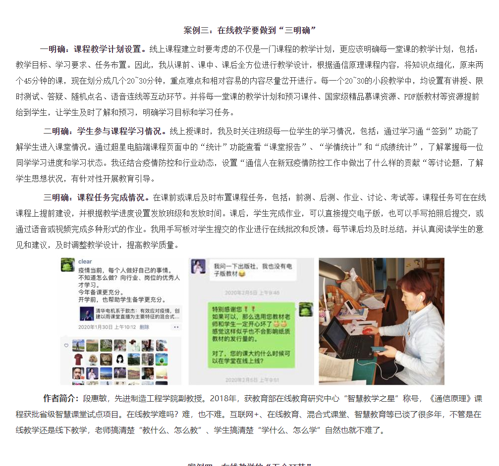 全體教師發揮教育教學主力軍作用。為應對疫情對正常教學計劃和教學秩序的影響,先進制造工程學院按照教育部《關于在疫情防控期間做好普通高等學校在線教學組織與管理工作的指導意見》工作部署,采用教師在家備課授課、學生在家學習的教學模式,實現“停課不停教、停課不停學”。29日,學院發布《合肥學院先進制造工程學院線上教學工作倡議》,全體教師第一時間接受任務,認真學習研討教學方式,確保了新學期課程的教學效果,充分展現了教育工作者在特殊時期所表現出應有的責任與擔當。截止到313日,我院大學物理教學部8名教師面向全校19個專業1017名同學開設了《大學物理》在線教學,四個教學系55名教師面向全院1603名同學開設了41門專業線上課程。面對特殊的上課模式,各科老師通過組建qq群、微信群等方式進行下達教學任務、傳輸教學內容等活動。為了防備網絡系統崩潰等問題,所有線上課程均準備了應急預案,提前進行了預演,教學辦公室每天及時收集反饋各科目學生上課情況,輔導員及時跟進了解、處理問題,有力保證了教學質量。