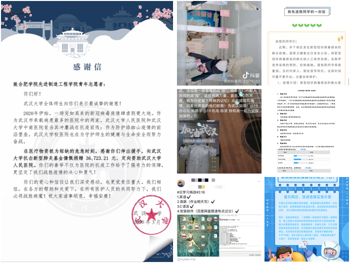 團組織積極發揮宣傳動員作用。先進制造工程學院團委組織線上系列防疫活動,講好防疫戰疫故事,傳遞青春正能量,已經陸續開展了“居家文體活動視頻征集”、“QQ空間接力為武漢加油”、“云學習挑戰”、“疫情期間防詐騙宣傳”等活動。28日,院團委與武漢大學人民醫院取得聯系后組織本院師生捐款,師生們積極響應,短短三天內捐款三萬六千余元,39日武漢大學向我院發來感謝信,感謝我院伸出援手,給予他們醫院抗疫工作強有力的保障,使得他們更加堅定了戰勝疫情的決心和勇氣。院團委充分利用網絡媒介,如官方QQ和微信公眾號等,向全院學生傳遞正能量。官方QQ每天發布至少一條防疫新聞動態,微信公眾號連續推出我院在防疫抗疫工作中表現突出的教師和學生典型專訪,以榜樣的力量引領全院學生。團員青年不甘示弱,在當地防疫志愿服務工作中表現出色,涌現了一批如王一然、涂凹等青年先鋒。