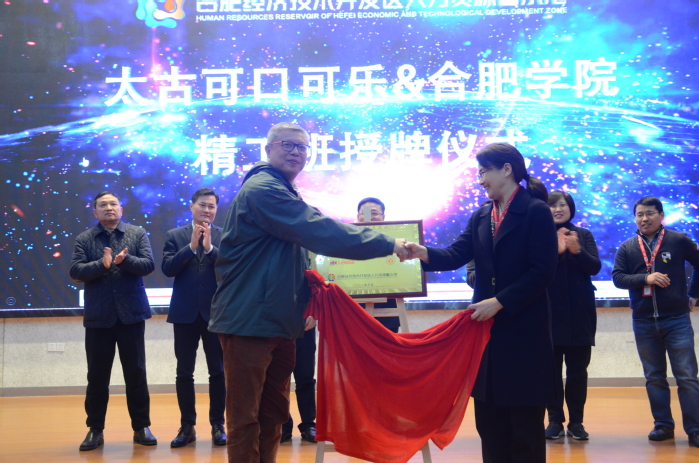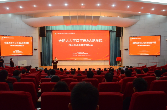 為促進校企深度合作,加強產教融合,3月4日上午,我校和合肥太古可口可樂飲料有限公司合作的“精工班”開班暨授牌儀式在學術報告廳A廳舉行。經開區人事勞動局局長劉干、人力資源中心主任王禮祥,太古可口可樂中國供應鏈總經理張曉東來校參加儀式,副校長陳秀出席活動,校黨員委員、教務處處長王曉峰,生物食品與環境學院院長俞志敏、副院長陳俊,先進制造工程學院副院長秦強,先進制造工程學院和生物食品與環境學院“精工班”師生等參加儀式,儀式由先進制造工程學院黨委書記杜娟主持。