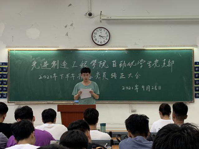 2021年9月26日16:00,先進制造工程學院自動化學生黨支部于36棟103教室召開了黨支部2021年下半年預備黨員轉正大會。自動化學生黨支部書記梅志強老師主持了本次大會,自動化學生黨支部全體黨員和9位群眾代表參加了大會。