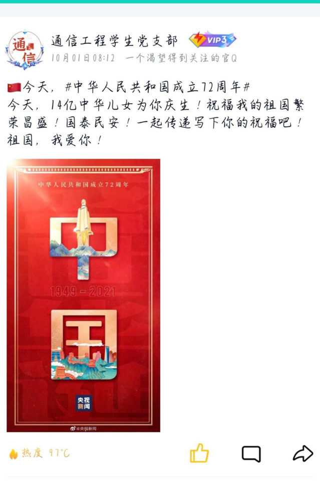 通信工程學生黨支部為慶祝祖國成立72周年,10月1月,通信工程學生黨支部通過官方QQ發布國慶節相關動態,在中華人民共和國成立72周年之際,通信工程學生黨支部官方QQ號邀請眾多師生為祖國慶生,共同寫下對祖國的美好祝福。