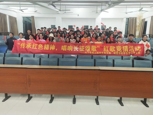本次紅歌友誼賽以紅歌為切入點(diǎn),以搶答的方式進(jìn)行,在主持人開始播放時(shí)即可搶答。比賽過程中,兩個(gè)黨支部成員積極的在“傳承紅色精神紅歌競(jìng)猜群”中回復(fù)“我要唱紅歌”進(jìn)行了搶答,電子黨支部成員張南成功搶答出了第一首紅歌,并且為我們演唱了其中一段,掌聲伴著歌聲回蕩在教室中,主持人也將這首紅歌的背景娓娓道來,悠揚(yáng)的歌聲里蘊(yùn)含著濃厚的愛國(guó)主義精神。接下來的比賽更加激烈,黨支部成員準(zhǔn)備充分,在歌聲響起的前奏中就能得出答案,隨著一首首的紅歌被猜出,場(chǎng)上的氣氛愈發(fā)高漲,在場(chǎng)的黨員和積極分子們積極參與答題,時(shí)不時(shí)引發(fā)一陣熱烈的掌聲,本次友誼賽共計(jì)15名同學(xué)成功答出了歌曲名,并且獲得了活動(dòng)獎(jiǎng)品,最后所有人舉起黨旗合影留戀。