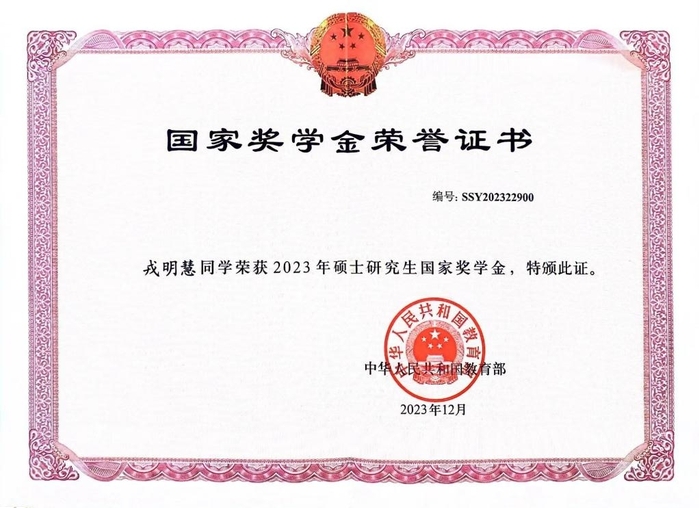 戎明慧表現(xiàn)優(yōu)異,成績名列前茅,綜合考評連續(xù)兩年位居班級第一,并榮獲2023年國家獎學金、2022年和2023年校學業(yè)一等獎學金,于2023年光榮地加入了中國共產(chǎn)黨。