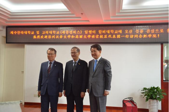 On May 16th, HFU President,Mr. Wang Qidong, meets the delegation from Cheju Halla University (CHU) and Korea University (Sejong Campus, KU-SC), led by Mr.Kim Sung-Hun, President of CHU, and Mr. An Cheung-O, Vice President of KU-SC.