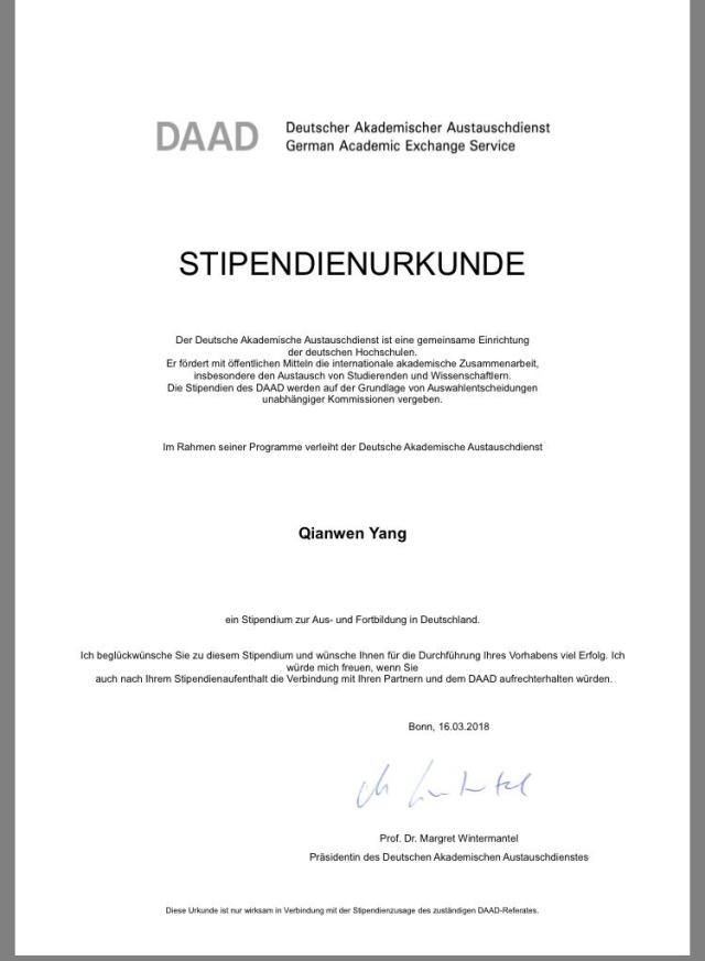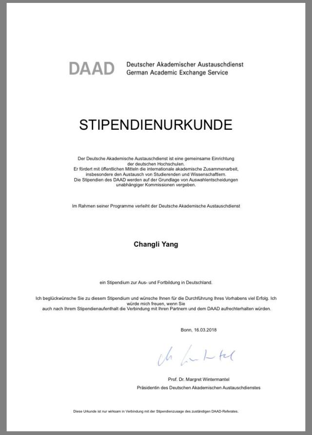 This is the first time that German majors have got a DAAD scholarship, which is designed for those to be engaged in the teaching of German.Yang Changli and Yang Qianwen took the German Language Proficiency Test at Nanjing University in November, 2017 and achieved much better than expected.  Whats more,Yang Changli participated in the National Multilingual Interpretation Contest and won the Excellence Award in the same year. They have set a good example for their counterparts in the Department of Foreign Languages.