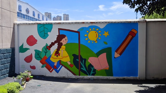 團隊成員帶領學生們參觀學校閱覽室,并向閱覽室捐贈了書籍;為校園里的植物掛上了親手繪制的木制銘牌,美化了校園環境,讓學生們學到了許多植物知識。經過前期的構思,團隊成員們在學校的墻上繪制彩繪,并結合課程元素繪制了黑板畫。