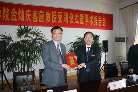 4月19日下午,合肥學院金燦慶客座教授受聘儀式暨學術報告會在院黃山路校區行政樓五樓會議室舉行,我院副院長陳嘯,外事處副處長吳克,化學與材料工程系主任邵國泉、黨總支副書記陸治河和師生代表出席了儀式和報告會。