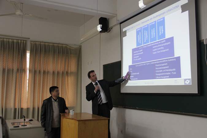 10月29日下午,德國奧斯納布呂克應(yīng)用科學(xué)大學(xué)代表團在我院南艷湖校區(qū)6號教學(xué)樓101多媒體教室舉行了一場關(guān)于LOGinCHINA(中德合作物流管理專業(yè))的專題報告會。合肥學(xué)院客座教授、奧斯納布呂克應(yīng)用科學(xué)大學(xué)經(jīng)濟系教授兼LOGinCHINA項目負責(zé)人Prof. Dr. Michael Schüller先生擔(dān)任本次報告會主講,奧斯納布呂克應(yīng)用科學(xué)大學(xué)經(jīng)濟系教授、教學(xué)主任兼對中國合作負責(zé)人Prof. Dr. Andreas Frey先生,合肥學(xué)院客座教授、安徽省教育廳特聘教育顧問、跨文化交際專家Prof. Dr. Karl-Wilhelm Blum先生, 奧斯納布呂克應(yīng)用科學(xué)大學(xué)德語教師Frau Margarete Hellmann女士,奧斯納布呂克應(yīng)用科學(xué)大學(xué)LOGinCHINA項目日常事物主管Frau Clare Gray女士、漢諾威中國中心駐京辦項目經(jīng)理徐榮女士出席此次報告會;管理系2011級LOGinCHINA (中德物流管理專業(yè))全體新生及任課的中德教師參加,報告會由合肥學(xué)院國際教育學(xué)院副院長徐剛主持并進行現(xiàn)場翻譯。