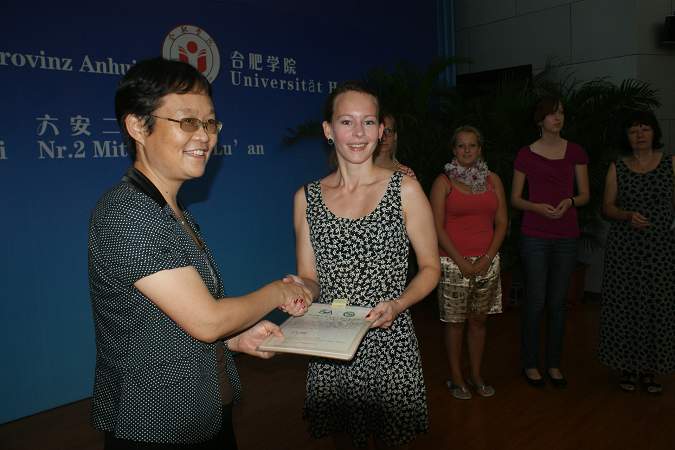安徽省教育廳外事處處長耿尊芳,漢諾威孔子學院院長胡春春,我院外事處處長吳克向德國學生頒發了國家漢辦授予的漢語證書。儀式結束后,中德學生同臺交流演出。德國同學表演了合唱、舞臺劇,對自己的學習作了匯報,體現了對中國文化的熱愛。(宣傳部)