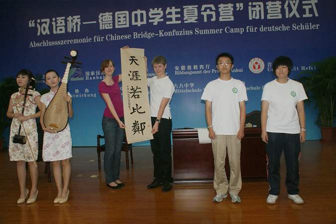 2011年8月15日上午,“漢語橋-德國中學生夏令營”閉營儀式在我院南艷湖校區隆重舉行。安徽省教育廳外事處處長耿尊芳,漢諾威孔子學院院長胡春春,我院外事處處長吳克、副處長賈峰以及協辦單位一六八中學、合肥八中、六安二中師生代表約三百人參加了儀式。