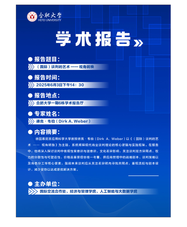 6月3日,德國慕尼黑應(yīng)用科學(xué)大學(xué)德克·韋伯(Drik A Weber)教授在一期學(xué)術(shù)報告廳為中德合作辦學(xué)專業(yè)的師生們做題為“國際談判的藝術(shù)—視角轉(zhuǎn)換”的學(xué)術(shù)報告。報告會由經(jīng)濟與管理學(xué)院吳悅副院長主持,國際交流合作處副處長孔春華、經(jīng)濟與管理學(xué)院、人工智能與大數(shù)據(jù)學(xué)院近百名師生參加報告會。