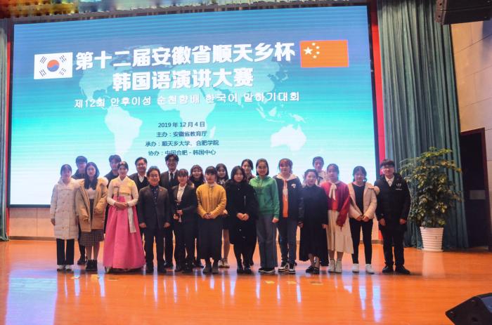 12月4日,第十二屆安徽省順天鄉(xiāng)杯韓國語演講大賽在合肥學(xué)院圖書館學(xué)術(shù)報告A廳舉辦。本次大賽由安徽省教育廳主辦,韓國順天鄉(xiāng)大學(xué)、合肥學(xué)院承辦,中國合肥-韓國中心協(xié)辦。安徽省教育廳外事處處長丁育紅、韓國順天鄉(xiāng)大學(xué)副校長徐昌洙等應(yīng)邀出席。合肥學(xué)院黨委書記、校長王其東,黨委副書記劉建中參加。開幕式由劉建中主持。