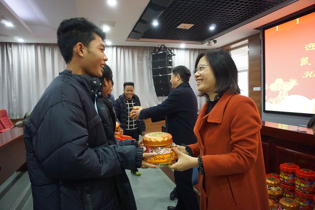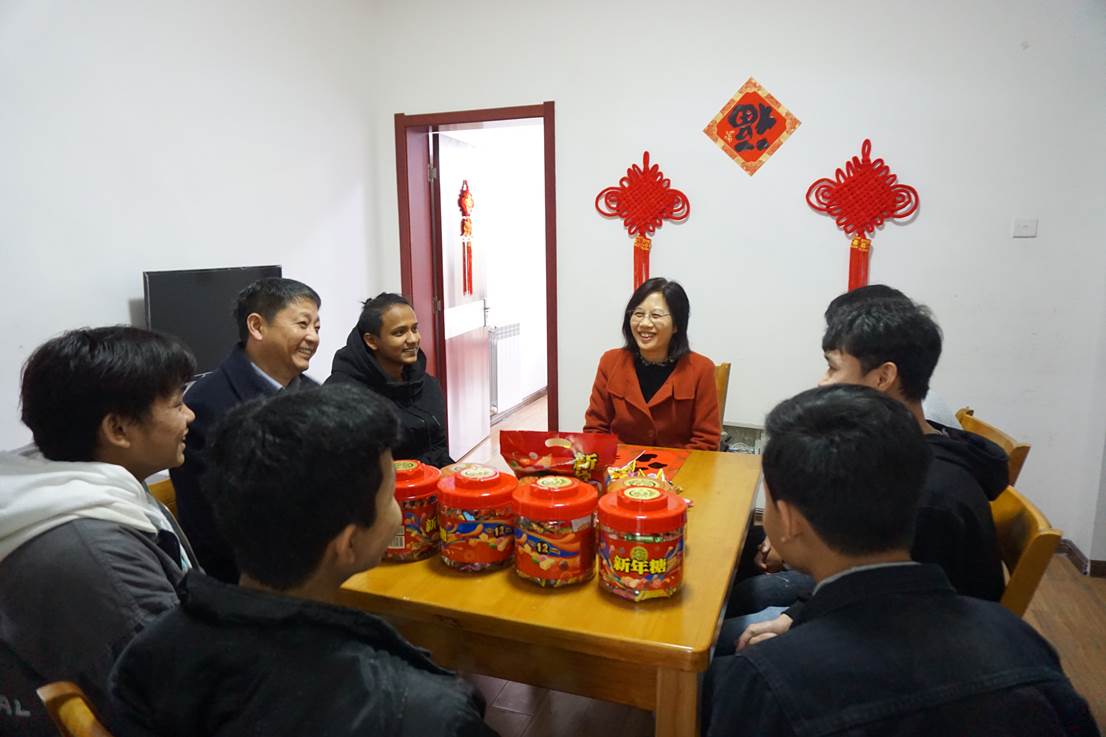 隨后,吳春梅一行來到學生宿舍,與留學生進行了親切的交談。她查看了留學生的居住環(huán)境,仔細詢問了學生在校期間生活學習情況,有沒有遇到什么困難,春節(jié)假期有什么安排。留學生用中文流利的回答,紛紛表示感謝學校的關懷,雖然春節(jié)不能回國回家,但在學校感受到了中國春節(jié)的溫馨和家的溫暖。吳春梅對留學生在校取得的成績表示了肯定,她提到,留學生來到合肥學院學習克服了語言、氣候和生活習慣等重重困難,有些同學將在中國度過第三個春節(jié),對中國的傳統(tǒng)文化有了更深的理解。希望大家學好中文和專業(yè)知識,了解中國文化和習俗,也借此機會代表學校向留學生及家人表達新春的祝福。