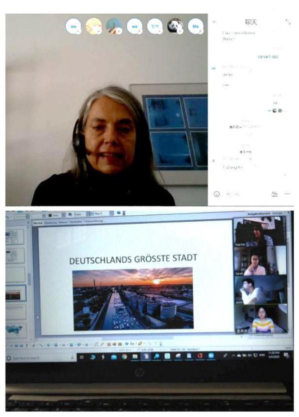 Loiswida Hansjuergens承擔(dān)著兩個(gè)班級的教學(xué)任務(wù),主要負(fù)責(zé)學(xué)生的口語訓(xùn)練,課時(shí)量較大。為了保證線上教學(xué)順利開展,她與班級負(fù)責(zé)課程的聯(lián)絡(luò)員積極保持溝通,就課程進(jìn)度和授課內(nèi)容進(jìn)行實(shí)時(shí)協(xié)作。除了利用Zoom平臺進(jìn)行直播上課外,她還借助PPT、音視頻、圖片和思維導(dǎo)圖等形式,激發(fā)學(xué)生的學(xué)習(xí)興趣和德語表達(dá)欲望,營造了輕松、愉快的德語線上學(xué)習(xí)氛圍。