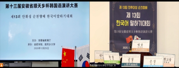 12月23日,由安徽省教育廳主辦、合肥學院和順天鄉大學承辦的第十三屆安徽省順天鄉杯韓國語演講大賽在我校舉辦。本次大賽全程在線上進行,來自安徽省內的15支參賽隊進入決賽,安徽省教育廳外事處姚德勇處長代表安徽省教育廳通過視頻的方式致辭,順天鄉大學校長徐教一和合肥學院副校長陳秀教授也分別通過視頻致辭并為參賽選手鼓勁加油。