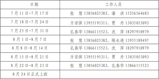 暑期實行輪休工作制,請大家根據工作分工和學校重點工作合理安排時間,對于異常情況及時上報,具體排班表如下: