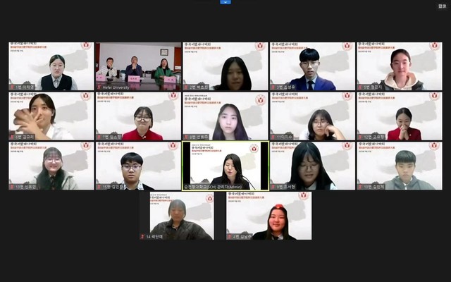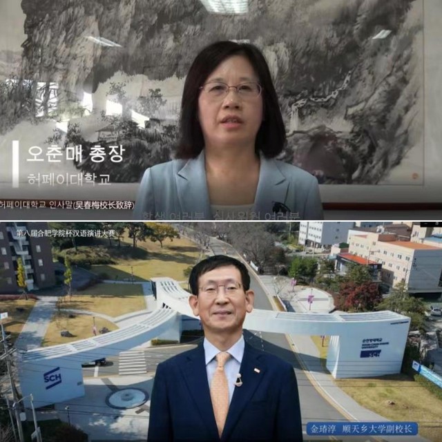 11月7日,由合肥學(xué)院主辦、韓國順天鄉(xiāng)大學(xué)承辦的第七屆“合肥學(xué)院杯”漢語演講大賽在韓國順天鄉(xiāng)大學(xué)成功舉辦。來自順天鄉(xiāng)高中、仁川世元高中等多所學(xué)校的韓國學(xué)生參賽,最終有15名選手進(jìn)入決賽。校長吳春梅和韓國順天鄉(xiāng)大學(xué)副校長金瑃淳通過視頻參加決賽開幕式并致辭。