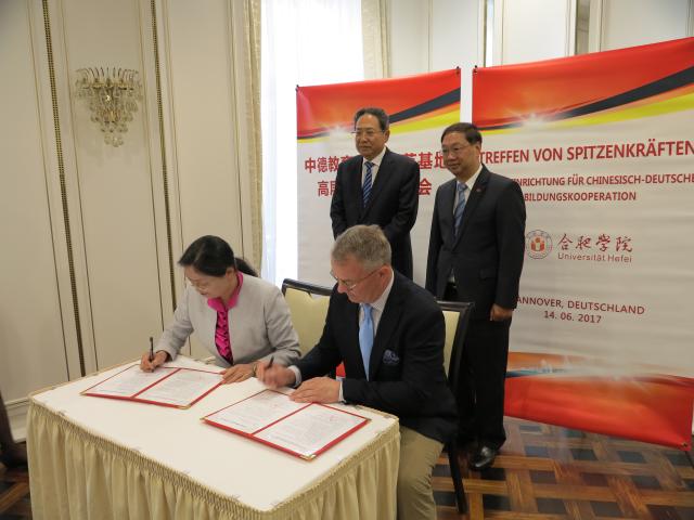 自2015年10月德國(guó)默克爾總理訪(fǎng)問(wèn)安徽以來(lái),中德合作示范基地在兩國(guó)政府關(guān)心支持下,建設(shè)工作取得積極進(jìn)展。6月7日至16日,省委書(shū)記李錦斌率安徽省經(jīng)濟(jì)友好代表團(tuán)赴美國(guó)、匈牙利、德國(guó)訪(fǎng)問(wèn)。李錦斌出席了合肥學(xué)院中德教育合作示范基地高層次人才引進(jìn)座談會(huì),與德國(guó)老專(zhuān)家、老教授們親切交談,聽(tīng)取他們對(duì)安徽開(kāi)展對(duì)德教育合作的意見(jiàn)建議。隨后,李錦斌見(jiàn)證了合肥學(xué)院引進(jìn)人才的集體簽約,并為對(duì)德引智項(xiàng)目管理辦公室揭牌。6月17日,安徽衛(wèi)視的安徽新聞聯(lián)播,詳細(xì)報(bào)道了錦斌書(shū)記出訪(fǎng)德國(guó)參加我校中德基地建設(shè)相關(guān)活動(dòng)。