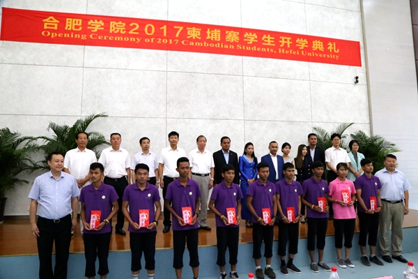 8月10日下午,合肥學(xué)院2017柬埔寨學(xué)生開學(xué)典禮在我院圖書館學(xué)術(shù)報(bào)告廳B舉行。柬埔寨國(guó)會(huì)議員、柬埔寨青年聯(lián)合會(huì)副主席蘇速卡及夫人孫蘇菲,柬埔寨人民黨菠蘿勉省主席班奈及夫人錢投,柬埔寨青年聯(lián)合會(huì)馬德望省主席瓦爾特及夫人納庫(kù),柬埔寨安徽商會(huì)會(huì)長(zhǎng)劉忍、原安徽省人大常委會(huì)副主任胡連松、安徽省外僑辦副主任張力芳、安徽省教育廳副廳長(zhǎng)解平、安徽省僑聯(lián)副主席楊冰,合肥市委副書記汪衛(wèi)東等出席,53名柬埔寨留學(xué)生到場(chǎng)參加。開學(xué)典禮由合肥學(xué)院副校長(zhǎng)劉建中主持。